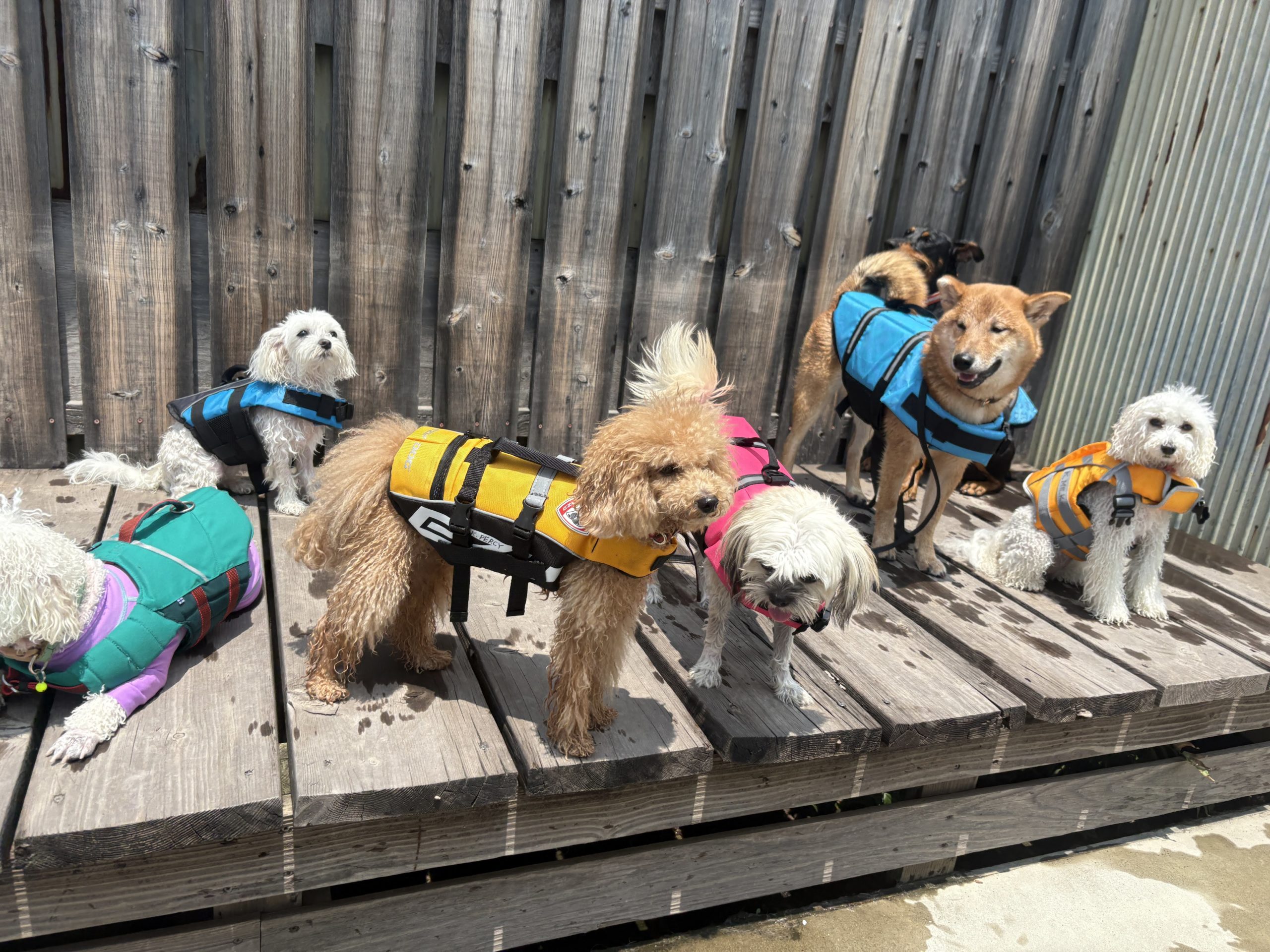 カラフルなライフジャケットをまとったわんこたち。色とりどりのチーム感がまるで○○レンジャー!