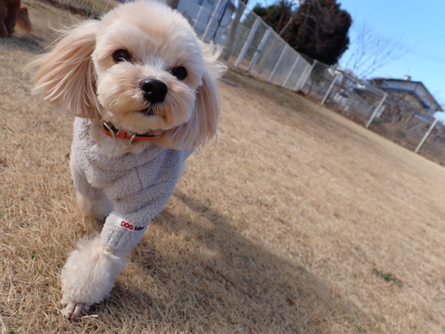 マルプーのマロちゃん、風で耳をなびかせながら歩いています。
